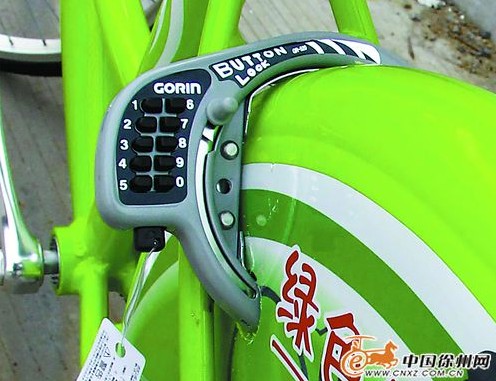 在安裝現(xiàn)場,一排排待裝的公共自行車次第排開,蘋果綠的主色調(diào)給人特別清爽的感覺?!斑@個車子是26型的,每輛車重14公斤,成年男子一只手就可以輕易提起?!卑惭b現(xiàn)場負(fù)責(zé)人袁永潤介紹,公共自行車車架的材質(zhì)和普通自行車無異,后泥瓦是塑料,車圈是鋁合金的,但它的車胎是橡膠實(shí)心的,“防扎,騎行的路上扎個鐵釘都不怕?!?br> 防盜密碼鎖