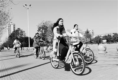 在安徽省阜陽(yáng)市,投入運(yùn)營(yíng)的公共自行車(chē)項(xiàng)目受到越來(lái)越多市民的青睞。圖為今年1月19日,阜陽(yáng)市民騎著公共自行車(chē)出行。