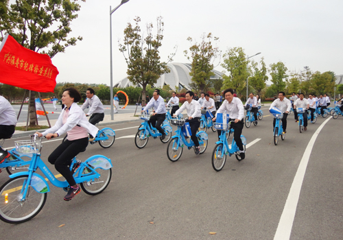 2006年,淮安舉辦了首屆全民健身運(yùn)動會,在全省引起較大反響。本次第二屆全民健身運(yùn)動會由市委市政府主辦,市體育局等7部門承辦,設(shè)4個部28項(xiàng)次比賽,將有一萬多人參加此屆運(yùn)動會。為全方位體現(xiàn)“全運(yùn)會”的特點(diǎn)及宗旨,運(yùn)動會采用了市民大力支持、廣泛參與的自行車環(huán)市行作為開幕式方案,真正體現(xiàn)了“全民健身全民參與”和“全民健身你我同行”的主旨。開幕式結(jié)束后,淮安市領(lǐng)導(dǎo)與萬余名市民共同參加騎自行車環(huán)市行活動。市領(lǐng)導(dǎo)們帶頭騎行在隊伍的最前面,全市近百個單位共萬余人組成113個方隊,緊跟在市領(lǐng)導(dǎo)方隊后騎行。自行車隊伍所到之處一片歡騰,整齊干練的著裝,精神抖擻的風(fēng)貌,意氣風(fēng)發(fā)的笑臉……祥和而熱鬧。而公共自行車的加入更是為活動增添了一道亮麗的風(fēng)景線,藍(lán)色的倩影在壯大的隊伍中顯得格外亮眼。引來了許多群眾駐足觀看,大家用掌聲和歡呼為隊伍加油助威。