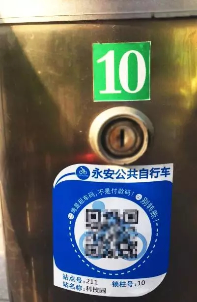 5、路人君在距離自己最近的一個(gè)站點(diǎn)上,發(fā)現(xiàn)每一個(gè)停車(chē)樁上都貼上了一個(gè)二維碼。