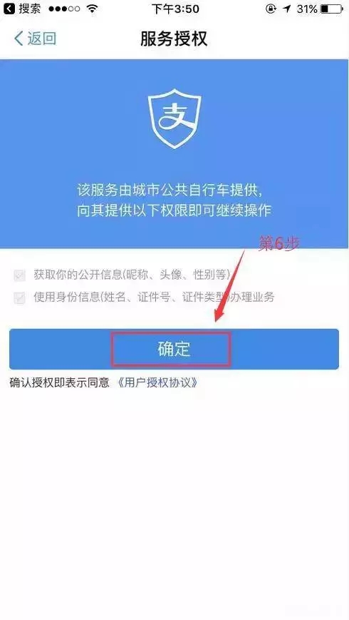 6、因?yàn)槭鞘状问褂茫?strong style="box-sizing: border-box !important; padding-bottom: 0px; margin: 0px; padding-left: 0px; padding-right: 0px; max-width: 100%; word-wrap: break-word !important; padding-top: 0px">會(huì)出現(xiàn)一個(gè)授權(quán)服務(wù),要求公開(kāi)一定的個(gè)人信息,以及使用身份信息辦理這項(xiàng)業(yè)務(wù)。如果沒(méi)問(wèn)題,點(diǎn)擊“確定”就好。