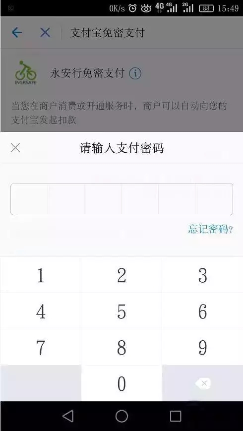 會(huì)出現(xiàn)一個(gè)設(shè)置支付密碼的界面。這是為了確保超過(guò)1小時(shí)后,, , 公共自行車(chē)向支付寶發(fā)起自動(dòng)扣費(fèi)。正常填寫(xiě)就好。