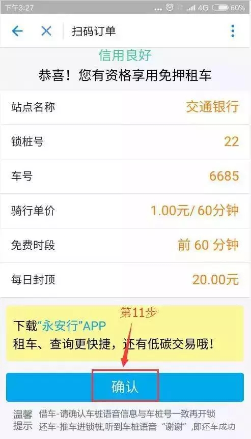 9、填寫(xiě)好支付密碼后,跳轉(zhuǎn)的界面上,我們可以看到上面有站點(diǎn)名稱(chēng)、鎖樁號(hào)、車(chē)號(hào)、騎行單價(jià)、免費(fèi)時(shí)段以及每日封頂。