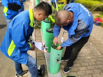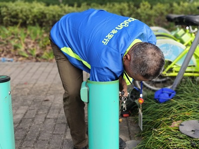 那邊比賽,師傅們紛紛伸手在綠色樁體內(nèi)“摸魚”。站點設(shè)備維修技能比賽是今年新增的項目,重點檢查公共自行車的鎖車及解鎖一體樁使用是否正常、站點底板是否銹蝕、鎖車及解鎖系統(tǒng)是否損壞等方面。