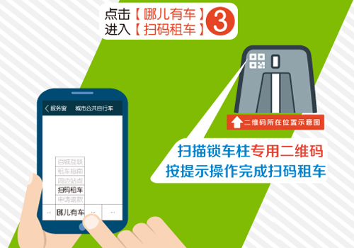 智能手機用戶點擊支付寶app,在“服務(wù)窗”內(nèi)搜索添加【城市公共自行車】,并進入【城市公共自行車】頁面;點擊“哪兒有車”中選擇“掃碼租車”;掃描鎖車柱上的掃碼租車專用二維碼,按提示操作即可輕松租車,流程簡單便捷。