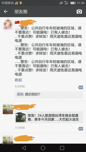 19日晚上,網(wǎng)友“清揚”發(fā)現(xiàn)朋友圈里不時有網(wǎng)友轉發(fā)一則提醒消息,這條消息看起來很貼心,但也讓人不免產(chǎn)生恐慌心理。這條消息內(nèi)容如下:“警告:公共自行車車樁被淹的區(qū)域,請不要靠近!可能漏電!已有人被擊!不要點贊,求轉發(fā)!雨天避免靠近易漏電電源?!迸笥讶D發(fā)這條內(nèi)容時,有人還配上公共自行車的圖,有的是將上面的內(nèi)容連說三遍,以引起受眾注意。